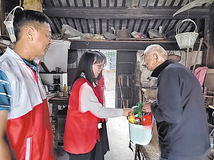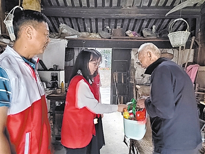 慈晓客户端慈圈“圈友”彼得潘的姐姐:宗汉街道漾山村志愿者为90岁以上老人送上女企业家陈黎徽捐赠的爱心物资。