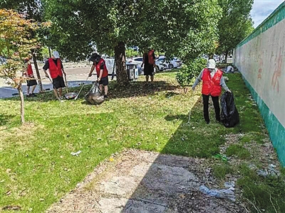 慈晓客户端慈圈“圈友”火箭熊出没:浒山街道金山社区志愿服务者顶烈日,冒酷暑,清洁家园。