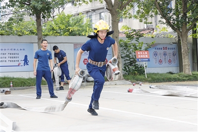 前天上午8时,阳光已经变得耀眼。记者来到浒山消防救援站时,31名队员正在热火朝天地训练。25名队员在做攀爬操,使用4米的挂钩梯快速爬上训练塔二层。另外6名新队员则在训练一人三带操,这是在模拟从消防车“突袭”火场的第一步操作。