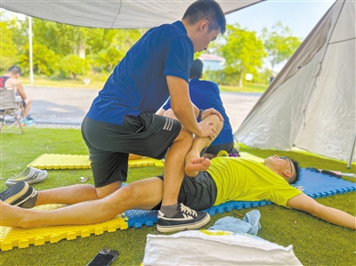近日,在森林公园跑道边,志愿者为跑步运动爱好者做拉伸修复,助力跑友备战即将开启的马拉松季。