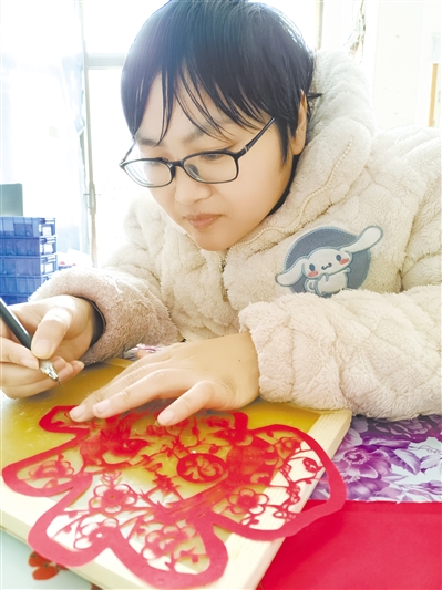 冬日上午,阳光透过窗户洒进了徐丹红的小店,今年39岁的她双手架在桌上,有些吃力地拿着刻刀,但这虚虚一握,却在红纸上渐渐刻画出栩栩如生的图案。“看,这个‘福’上都是吉祥的元素!”徐丹红轻声介绍着她的创作。