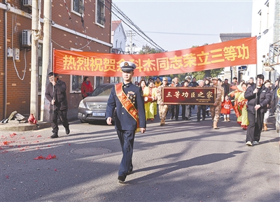 近日,市人武部、市退役军人事务局、白沙路街道为荣立三等功的退役军人余科杰举行热烈的欢迎仪式,并为他及家属送上“三等功臣之家”牌匾、立功喜报,传递党和政府的关怀与温暖。