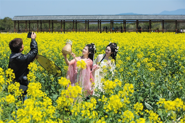3月18日,游客在福建省武夷山市黄柏村的油菜花田间拍照。仲春时节,人们走进大自然,尽享春日芳华。