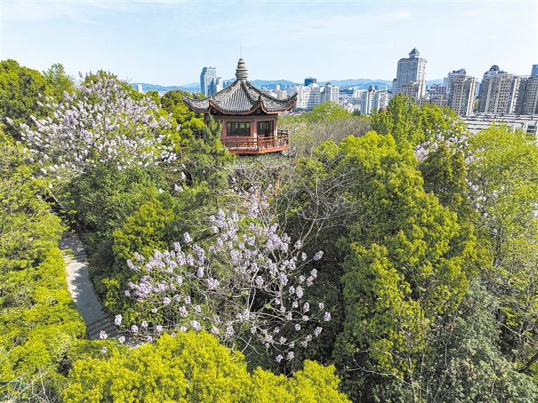 天气转暖,教场山公园宁靖塔下,泡桐花开缀满枝头。宁靖塔与淡紫色的花朵相映成趣,登塔远眺,日新月异的城区映入眼帘,一派春和景明。