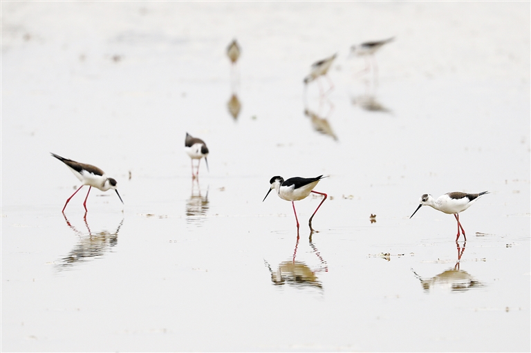 近日,在匡堰镇一处农田里,一小群长脚鹬在悠然觅食。这些精灵时而曲颈啄食,时而舒展双翼,修长的脚杆在水面划出涟漪,黑白分明的翅羽倒映在水面上,宛若一幅灵动的生态工笔画。