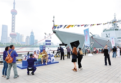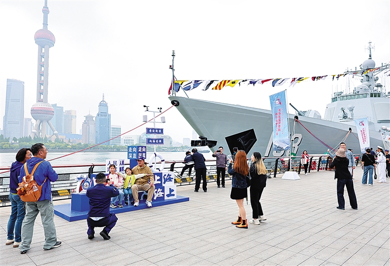 4月22日,市民游客在导弹驱逐舰西安舰前拍照留念。当日,在人民海军成立76周年之际,驻沪海军部队联合上海市双拥办共同组织以“上海·海上”为主题的舰艇开放活动。两艘海军现役主战舰艇综合登陆舰沂蒙山舰和导弹驱逐舰西安舰靠泊上海港国际客运中心码头,市民游客不仅能够登舰参观,还在现场观看和参与文艺表演和国防教育科普活动。