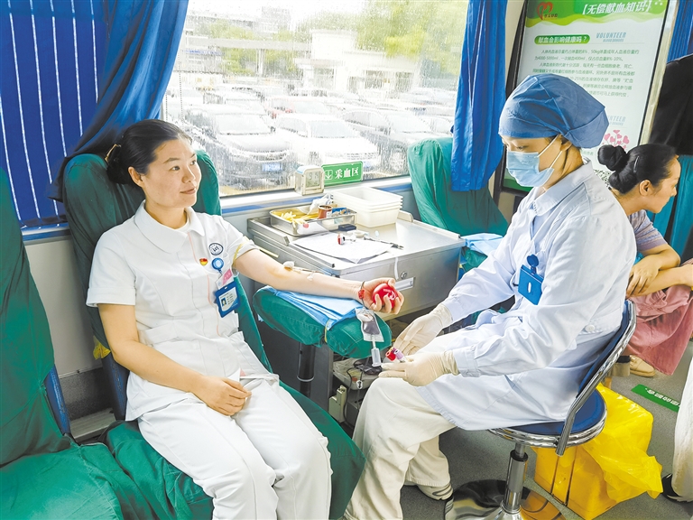 ◀日前,慈溪弘和医院党支部开展6·14世界献血者日主题党日活动,现场医务人员纷纷撸袖献血,用实际行动诠释了医者仁心的精神,也展现了医务人员的社会责任感。据悉,此次献血活动共22人成功献血6500ml。