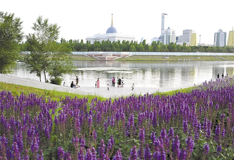 夏日的阿斯塔纳,天气晴好、鲜花盛开,天际线在蓝天白云的映衬下格外美丽。