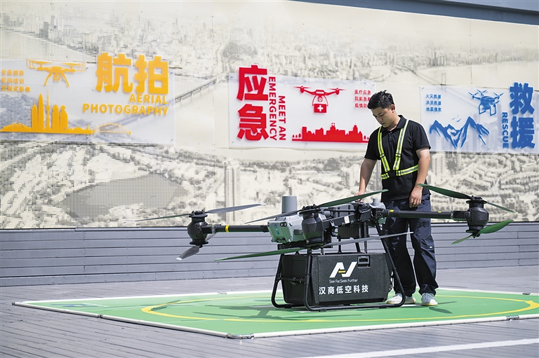 6月16日,在汉商低空港停机坪,一名工作人员在起飞前检查无人机工作状态。