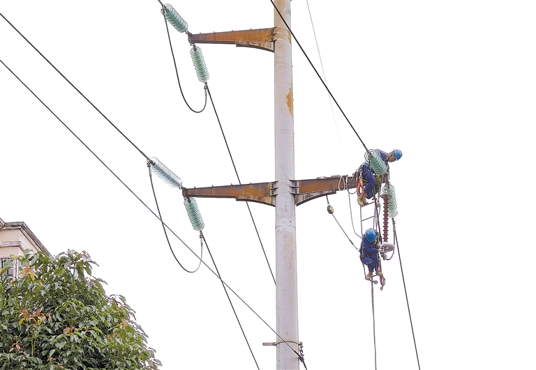 随着气温持续攀升,夏季用电高峰期正悄然临近,近日,电力工人对开发大道上的线路进行检修,全力保障电网稳定、可靠、安全度峰。■摄影 全媒体记者 王烨江 通讯员 姚科斌