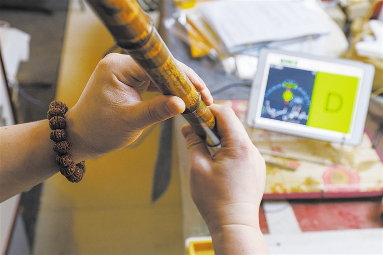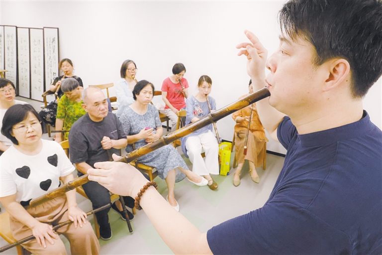 于景安在宗汉街道桃园江社区洞箫公益课上讲解洞箫技艺。