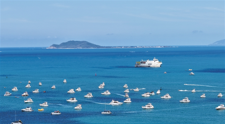 6月24日,众多游艇在海南三亚湾海面上驰骋(无人机照片)。