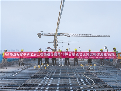 本报讯 晨曦微露,通苏嘉甬高铁慈溪特大桥建设工地上,已是灯火通明、人机繁忙。日前,随着最后一辆混凝土搅拌车缓缓将料卸入输送泵,巨大的泵车长臂精准地将最后一方混凝土注入预先架设好的模板中——由中铁北京局承建的通苏嘉甬高铁X标一分部慈溪特大桥项目408-414#墩处的首联6×32.7米道岔连续梁A段顺利完成浇筑。(见下图)