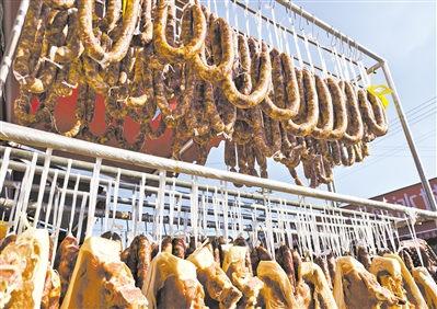 冬日 腊味飘香 冬日时节,横河镇宜青桥肉铺摊前的腊味成了一道独特风景。一串串腊肠、一块块腊肉整齐悬挂,在阳光下散发着浓郁的香气,为寒冷的冬日增添了烟火气息。 ■摄影 全媒体记者 王烨江